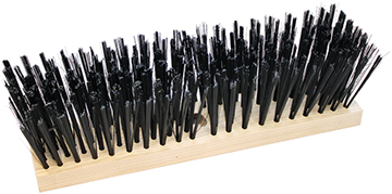 16in wire street broom, 5 rows, .014 gauge tempered round steel wire, 3-3/4in trim, tapered handle hole. Cuts caked debris. Used around hotft areas. 6/Ctn