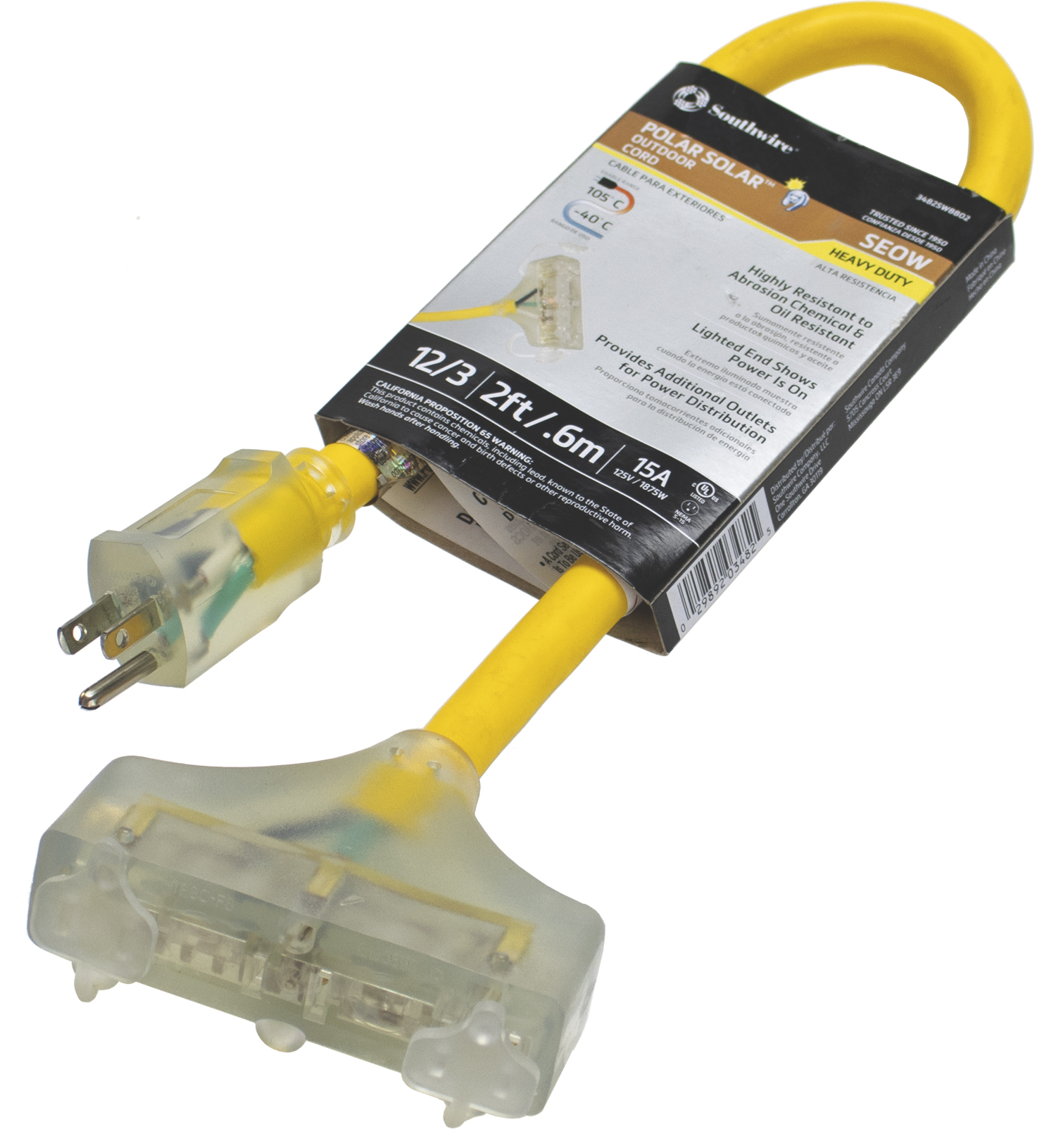 2ft Lighted Triple Tap Adapter, 12/3 gauge, SJEOW, 600V Polar cord for use in minus 67deg F weather. 12/Ctn